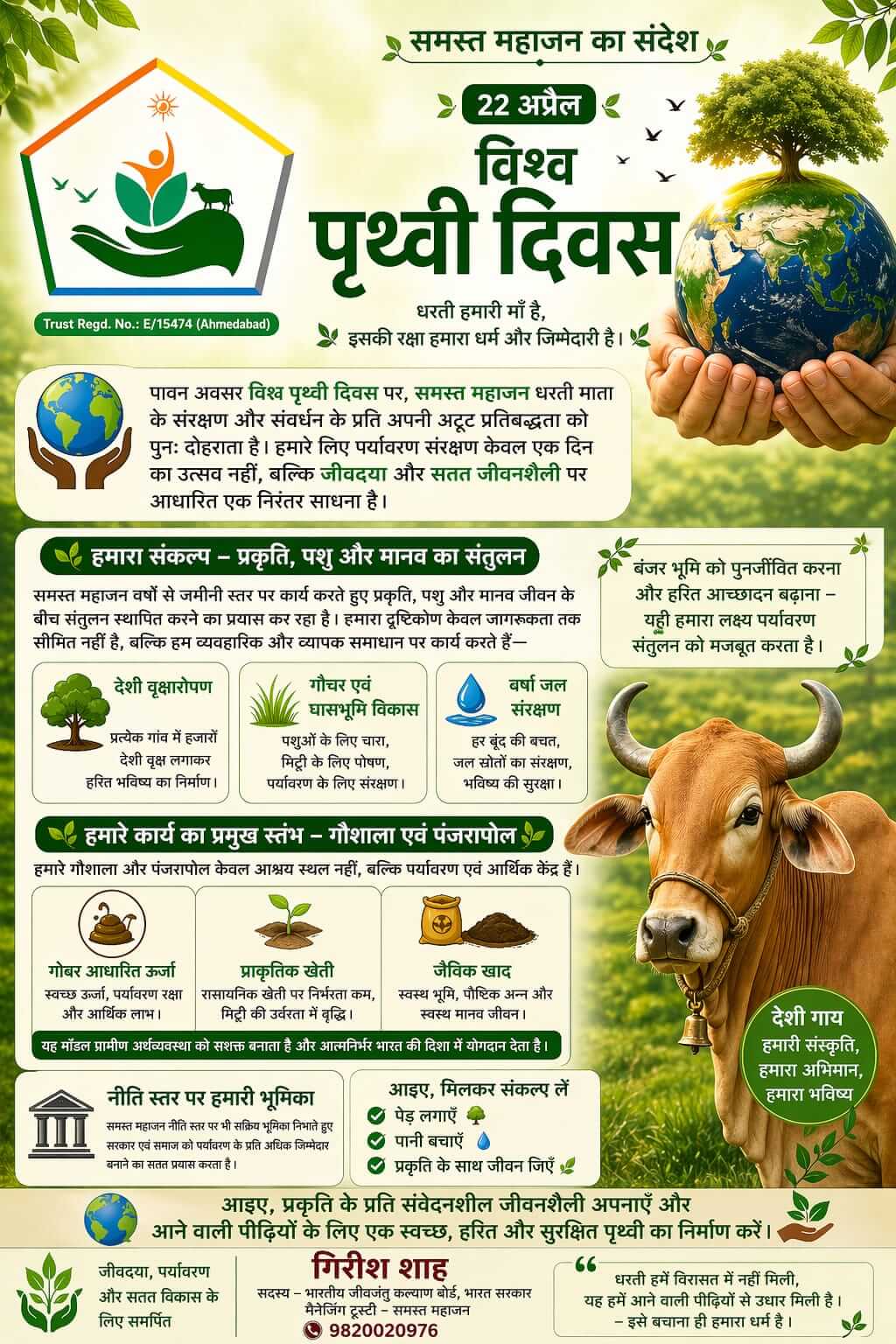 unwavering dedication to the welfare of all living beings, environmental conservation, and sustainable development. The impactful initiatives, such as support for Gaushalas, grassland development, water rejuvenation, and tree plantation, inspire collective action towards a better world.
